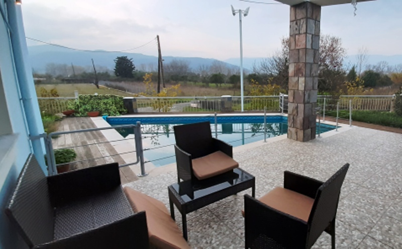 Vila Dinos se nalazi u mirnom delu “novog Stavrosa” na 400 metara od plaže. Raspolaže apartmanima raspoređenim u prizemlju i na prvom spratu. Svi apartmani su jako prostrani, sa kompletno opremljenom čajnom kuhinjom, novim kupatilima, TV uređajem, wi-fi internetom i balkonima. Gostima je na raspolaganju bazen u okviru dvorišta, kao i spoljašnji đakuzi. U uglu dvorišta se nalazi zidana skara za pripremu roštilja.